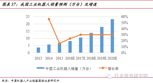工業(yè)機(jī)器人的大規(guī)模使用,不僅可以助推企業(yè)轉(zhuǎn)型,而且也給智能制造業(yè)帶來(lái)巨大的市場(chǎng)需求。從全球來(lái)看,2014年工業(yè)機(jī)器人年銷售額約59億美元,銷量為22.5萬(wàn)臺(tái)左右,比2013年增長(zhǎng) 27%。我國(guó)是世界上增長(zhǎng)最快的市場(chǎng),前瞻產(chǎn)業(yè)研究院提供的數(shù)據(jù)顯示, 2015年工業(yè)機(jī)器人銷量高達(dá)66000臺(tái),在2013 年的基礎(chǔ)上增長(zhǎng)了 80%,繼續(xù)保持高速發(fā)展態(tài)勢(shì)。
