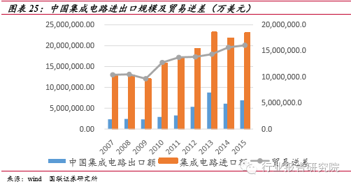 國(guó)內(nèi)需求充足,進(jìn)口替代空間巨大。中國(guó)集成電路市場(chǎng)規(guī)模雖然大,但不可回避的問題是其自給率偏低。據(jù)海關(guān)統(tǒng)計(jì),2015 年中國(guó)集成電路進(jìn)口金額比去年同期增長(zhǎng)6%,達(dá)到2307億美元,而出口金額為僅為693.1億美元,進(jìn)出口逆差仍然有1613.9億美元,這表明國(guó)內(nèi)有極大的進(jìn)口替代空間。