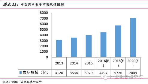 汽車電子類產(chǎn)品通常落后消費(fèi)類電子產(chǎn)品一個(gè)時(shí)期,正如過去幾年手機(jī)行業(yè)所經(jīng)歷的那樣,汽車業(yè)正在由“功能機(jī)”向“智能機(jī)”發(fā)展,這將給電子行業(yè)帶來(lái)新的增長(zhǎng)引擎。受惠于各國(guó)汽車安全政策加持,近期汽車電子輔助行車安全的趨勢(shì)已十分明確,越來(lái)越多類似TPMS、倒車影像、自動(dòng)剎車系統(tǒng)等新應(yīng)用崛起。各大車企、互聯(lián)網(wǎng)公司紛紛加快在車聯(lián)網(wǎng)和自動(dòng)駕駛領(lǐng)域的產(chǎn)業(yè)布局,車聯(lián)網(wǎng)有望成為第一個(gè)實(shí)現(xiàn)的物聯(lián)網(wǎng)應(yīng)用空間廣闊,存量與增量汽車市場(chǎng)規(guī)??捎^。2015 年中國(guó)汽車電子市場(chǎng)規(guī)模為3,979億元,同比增長(zhǎng)12.6%,2013~2015年中國(guó)汽車電子市場(chǎng)規(guī)模平均增長(zhǎng)率為13.7% 。中商產(chǎn)業(yè)研究院預(yù)測(cè)2016年中國(guó)汽車電子市場(chǎng)規(guī)模為4497億元。賽迪顧問預(yù)計(jì)到2016年中國(guó)汽車電子市場(chǎng)將保持 10%以上的增速,同時(shí)汽車電子在整車成本中的占比將超過50% 。我們判斷中國(guó)汽車電子市場(chǎng)增長(zhǎng)方式正在由汽車產(chǎn)量增長(zhǎng)轉(zhuǎn)向功能需求驅(qū)動(dòng)。